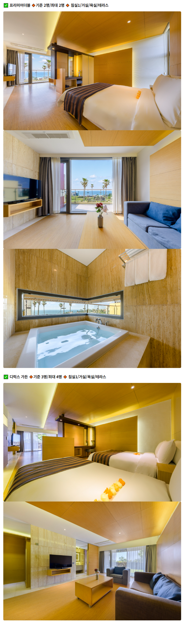 ㆍ객실 이용 시 최대 인원을 초과하여 입실하실 수 없습니다.크기50m2기준3 명최대4 명타입더블+싱글전망오션뷰