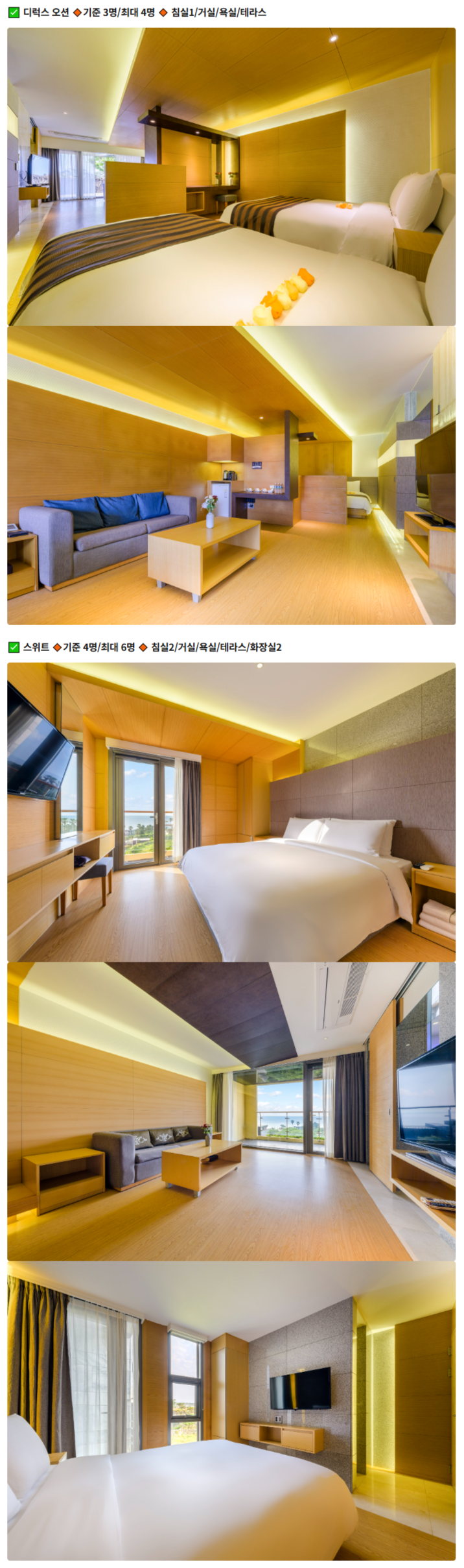 ㆍ객실 이용 시 최대 인원을 초과하여 입실하실 수 없습니다.크기116m2기준4 명최대6 명타입더블+더블전망오션뷰
